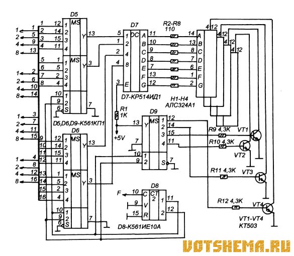 Все одноименные сегментные выводы индикаторов Н1-Н4 соединены вместе, поэтому, семисегментный код с выхода D7 поступает одновременно на входы всех четырех индикаторов. То, какой из индикаторов в этот момент будет включен зависит от мультиплексора D9, который, в данном случае выполняет роль десятичного дешифратора. Сигналы с выхода этого мультиплексора поступают на транзисторные ключи VT1-VT4, которые управляют питанием индикаторов.