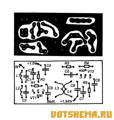 Катушки L1 и L2 не имеют каркасов, их диаметр 6 мм, а намотка ведется проводом ПЭВ-0,8. L1 содержит 4 витка, a L2 — 7 витков. Катушки L3 и L4 намотаны на пластмассовом каркасе диаметром 6 мм и высотой 10 мм с подстроечным сердечником СЦР диаметром 5 мм и длиной 8 мм. Катушка L4 содержит 12 витков провода ПЭВ-0,25, а катушка L3 намотана поверх L4 и содержит 2 витка того же провода.