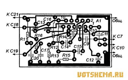 Но в этом случае максимальная мощность ниже. Детали узла регулировок монтируются непосредственно на выводах переменных резисторов, установленных на передней панели корпуса усилителя. Поскольку регуляторы пассивные, - так удобнее во всех отношениях. Детали непосредственно усилителя монтируются на небольшой печатной плате, схема которой приводится на рисунке 2.