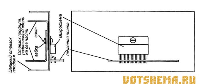 Печатная плата не имеет собственных крепежных элементов. - крепится она на радиатор посредством радиаторной пластины микросхемы, одним винтом. Для отвода тепла от микросхемы используется радиатор, конструкция которого показана на рисунке 3.
