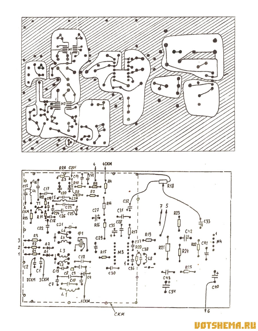 Схема приёмного тракта смонтирована на плате по рис. 3 и 4. Селектор СКМ 24 располагается над печатной платой (его положение отмечено пунктиром). Крепится он пайкой к луженым проводкам диаметром 1,2 мм, впаянных в отверстия платы по пунктирной линии. Проводки припаиваются непосредственно к корпусу селектора.